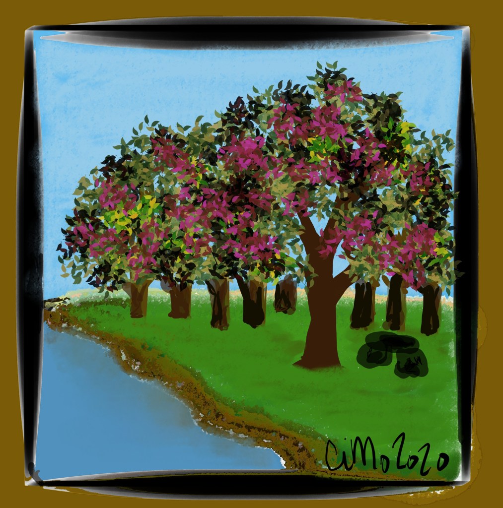 Cloudless azure skyRelaxing near sapphire streamsThe color of joy